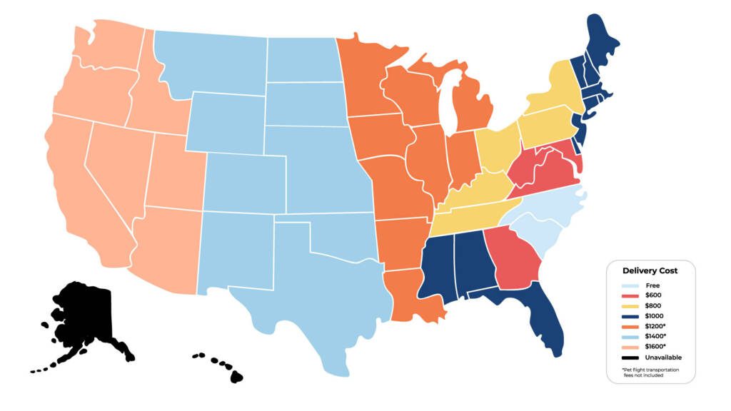 We deliver our puppies all across the US! Please see the chart below for delivery options and associated fees. To save on delivery fees, you may also come pick up your puppy from our training center in Charlotte, NC.